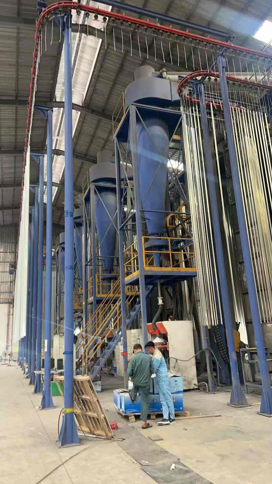 주요 구성 요소:분체 도장 행잉 컨베이어 시스템, 로딩 및 언로딩 시스템, 전처리, 건조 오븐, 분체 도장 챔버 및 재활용 시스템, 경화 오븐, 전기 제어 시스템, 분체 도장 건, 분말 공급 센터, 에어 컴프레서, DI 정수기 시스템 등.